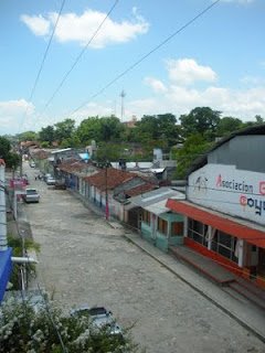 Una tipica vista de alguna parte del pueblo de Coyutla, calles empedradas, casas y casonas con cierta historia, cielo azul, nubes blancas, vegetacion verde, abundante y espesa; y desde luego, gente de este y otros pueblos caminando sobre las calles empedradas: